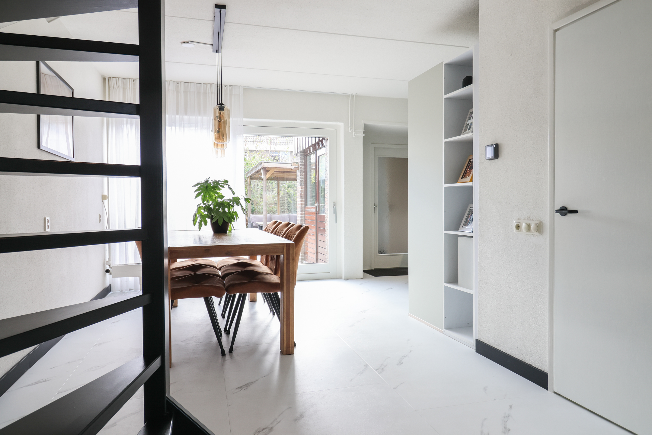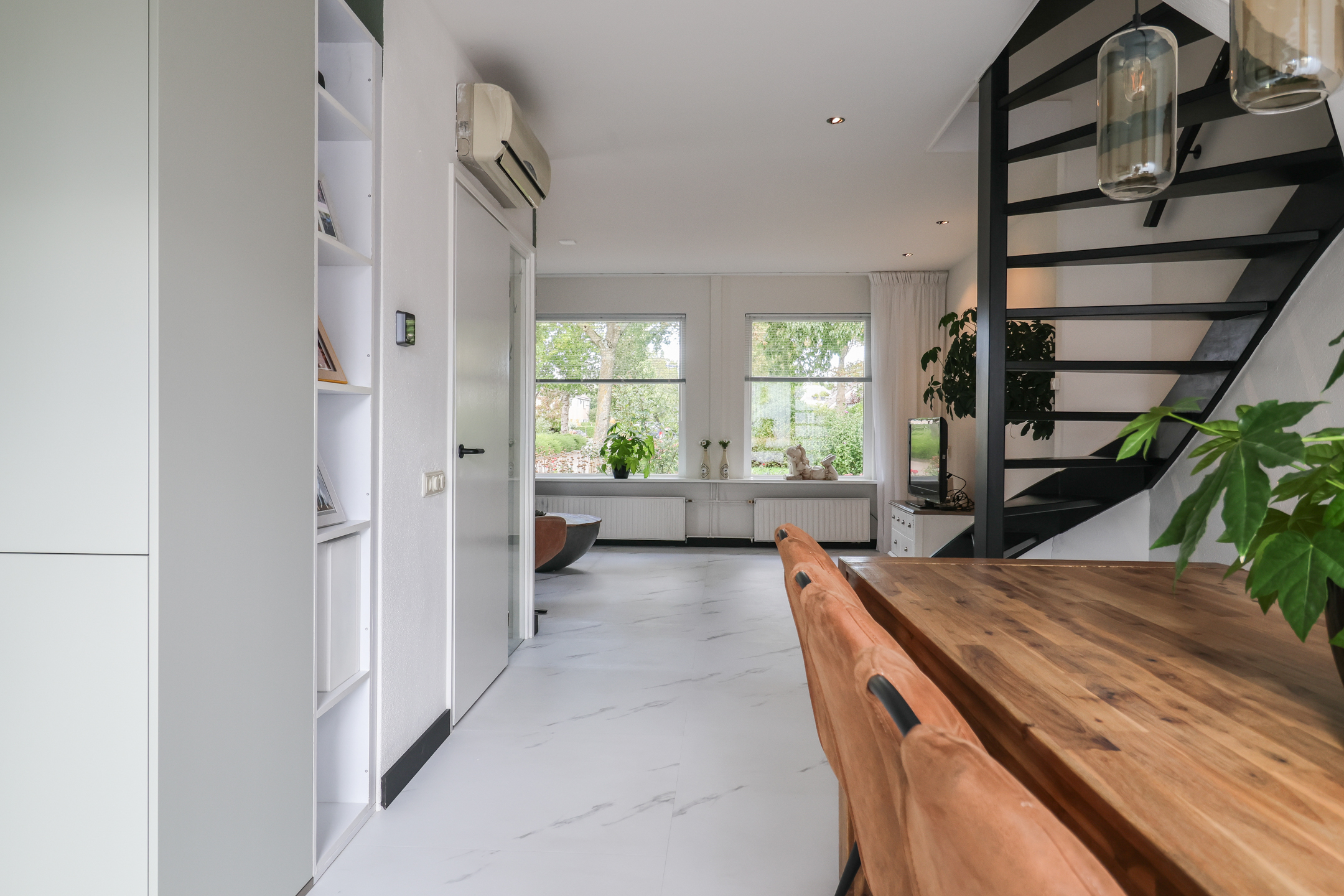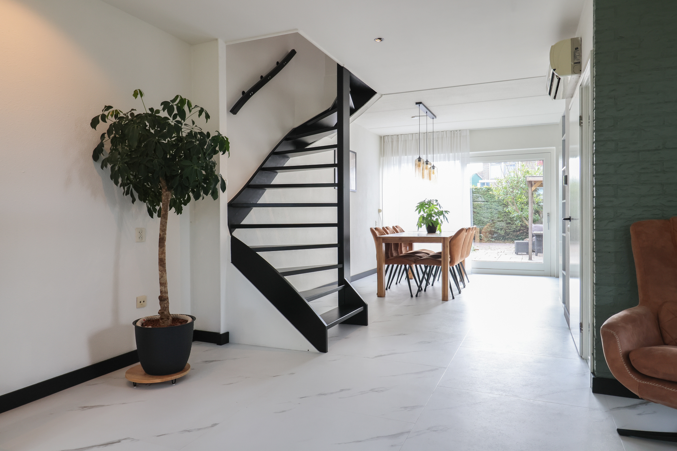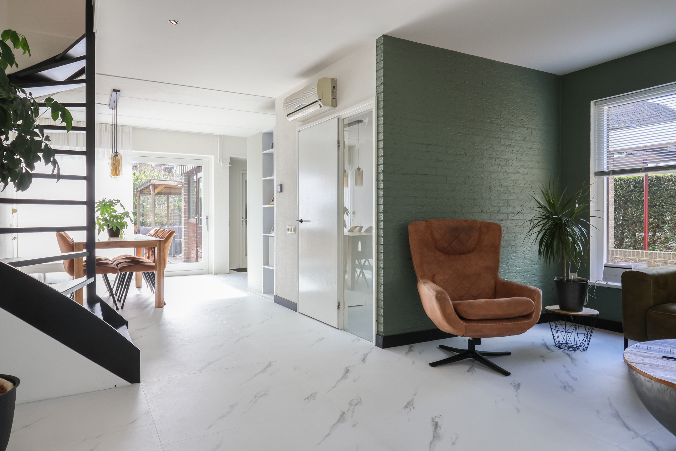 Entree met vernieuwde meterkast (2025) en toilet. De royale woonkamer is voorzien van vloerverwarming en een stijlvolle pvc-vloer in marmerlook. De woonkamer wordt in de zomer gekoeld met een airco-installatie, waardoor het binnen altijd aangenaam is. De luxe hoekkeuken (2025) is uitgerust met moderne inbouwapparatuur, waaronder een vaatwasser, inductiekookplaat, oven, koel-vriescombinatie én een inbouwkoffiezetapparaat. Via openslaande deuren stap je direct de ruime en zonnige tuin in, perfect om in alle privacy te genieten van het buitenleven. Achter de keuken bevindt zich de bijkeuken met witgoedaansluiting en toegang tot de ruime inpandige garage.
