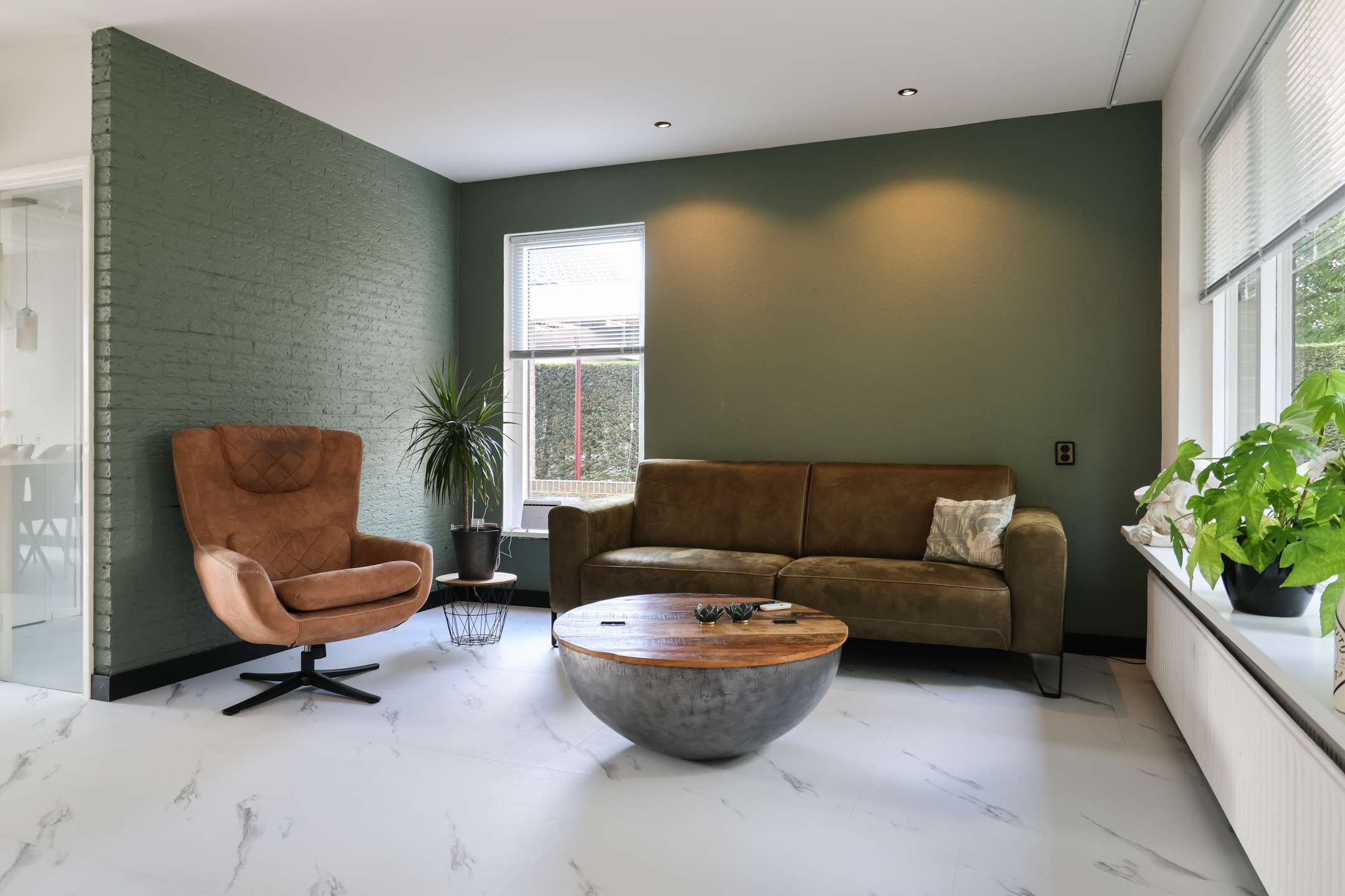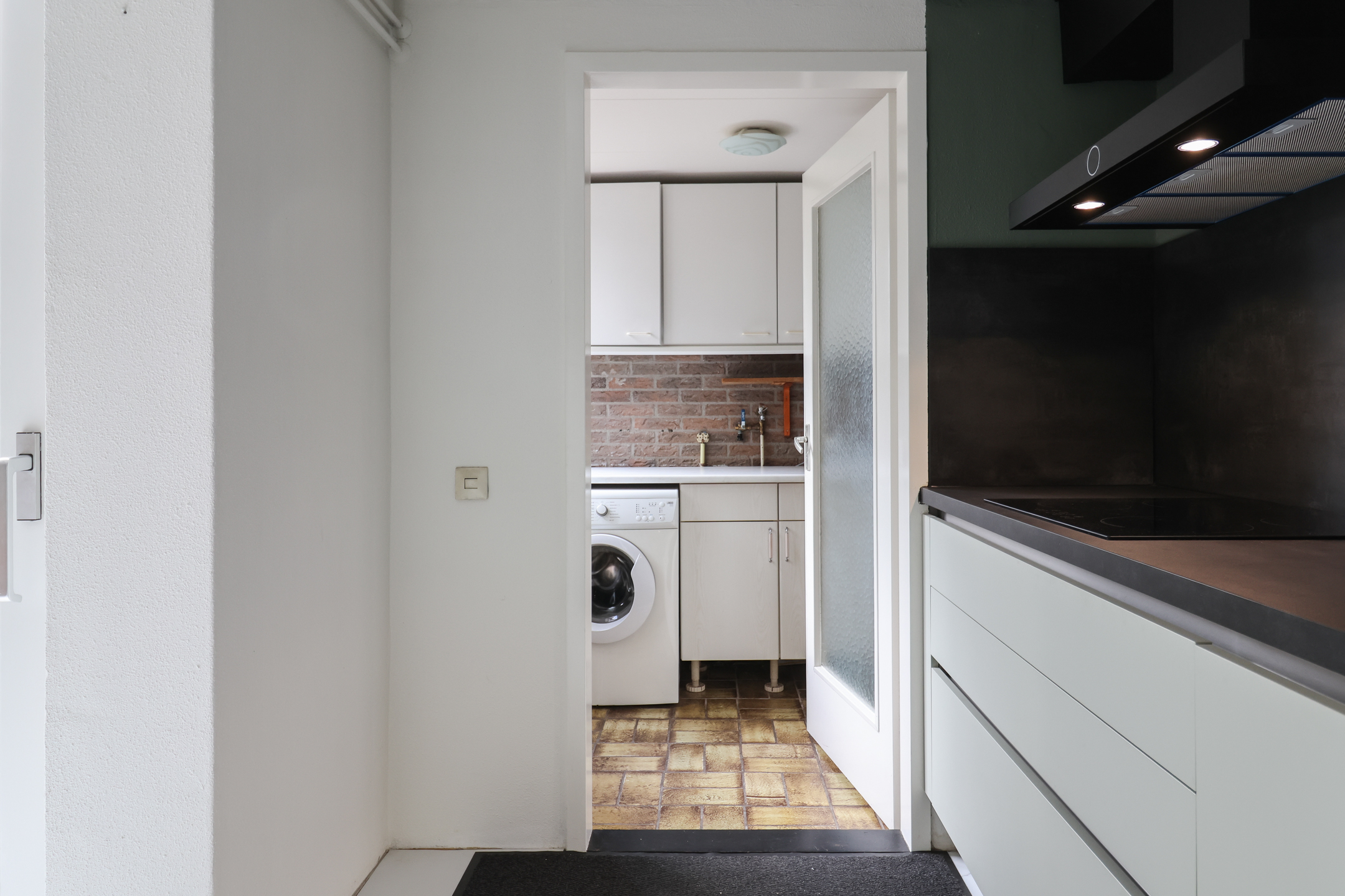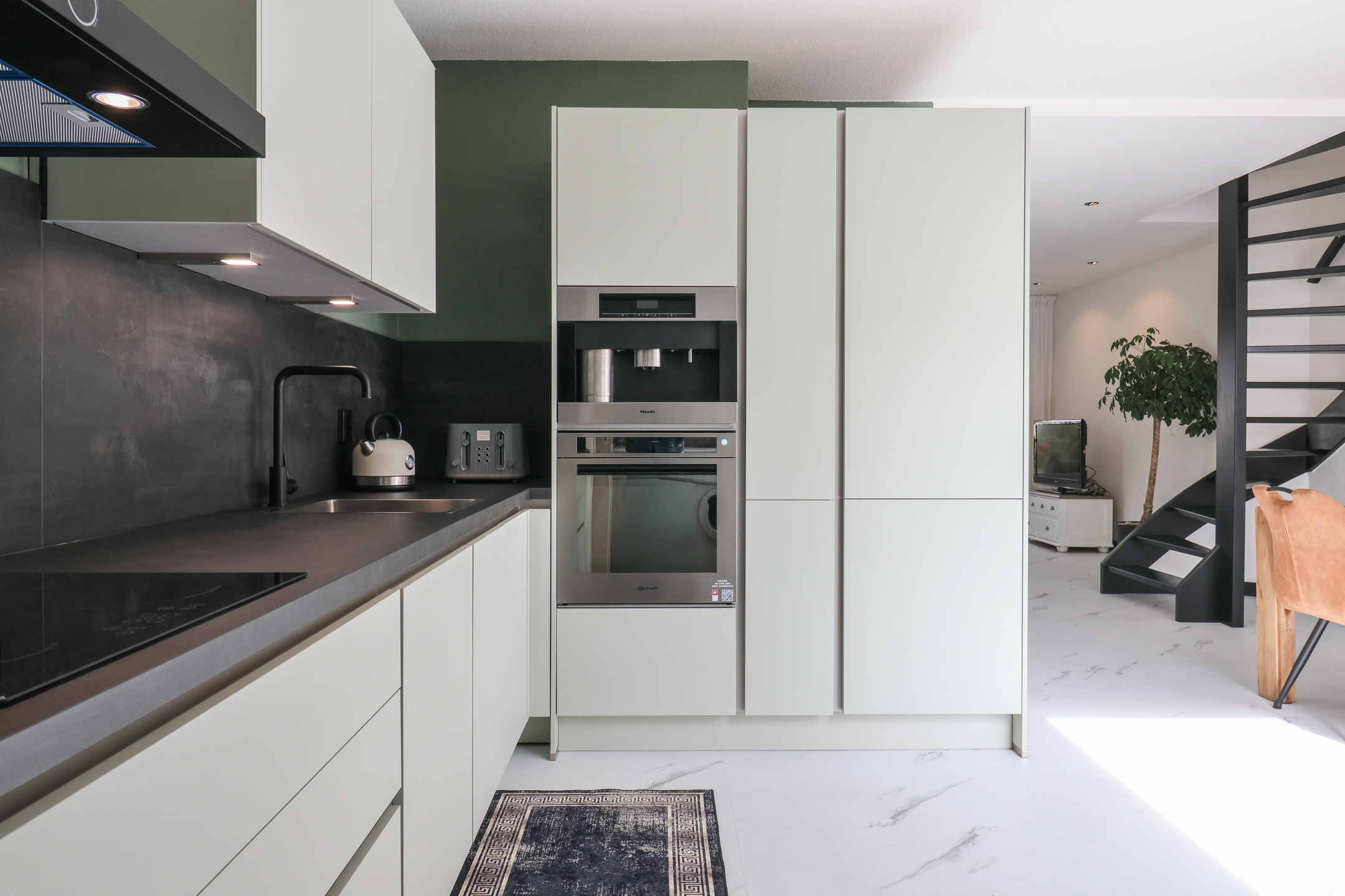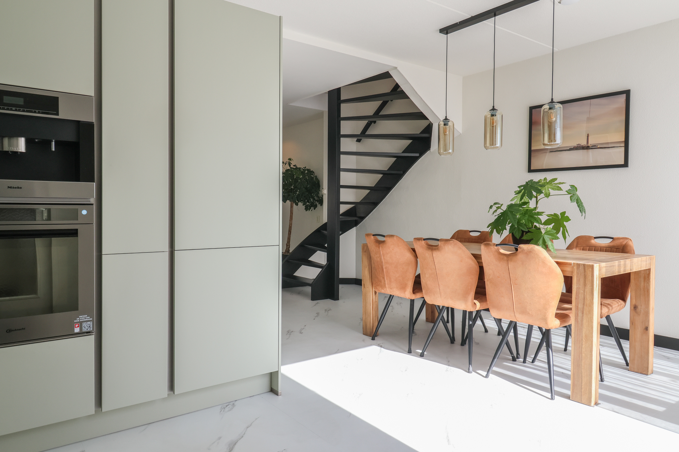 Entree met vernieuwde meterkast (2025) en toilet. De royale woonkamer is voorzien van vloerverwarming en een stijlvolle pvc-vloer in marmerlook. De woonkamer wordt in de zomer gekoeld met een airco-installatie, waardoor het binnen altijd aangenaam is. De luxe hoekkeuken (2025) is uitgerust met moderne inbouwapparatuur, waaronder een vaatwasser, inductiekookplaat, oven, koel-vriescombinatie én een inbouwkoffiezetapparaat. Via openslaande deuren stap je direct de ruime en zonnige tuin in, perfect om in alle privacy te genieten van het buitenleven. Achter de keuken bevindt zich de bijkeuken met witgoedaansluiting en toegang tot de ruime inpandige garage.