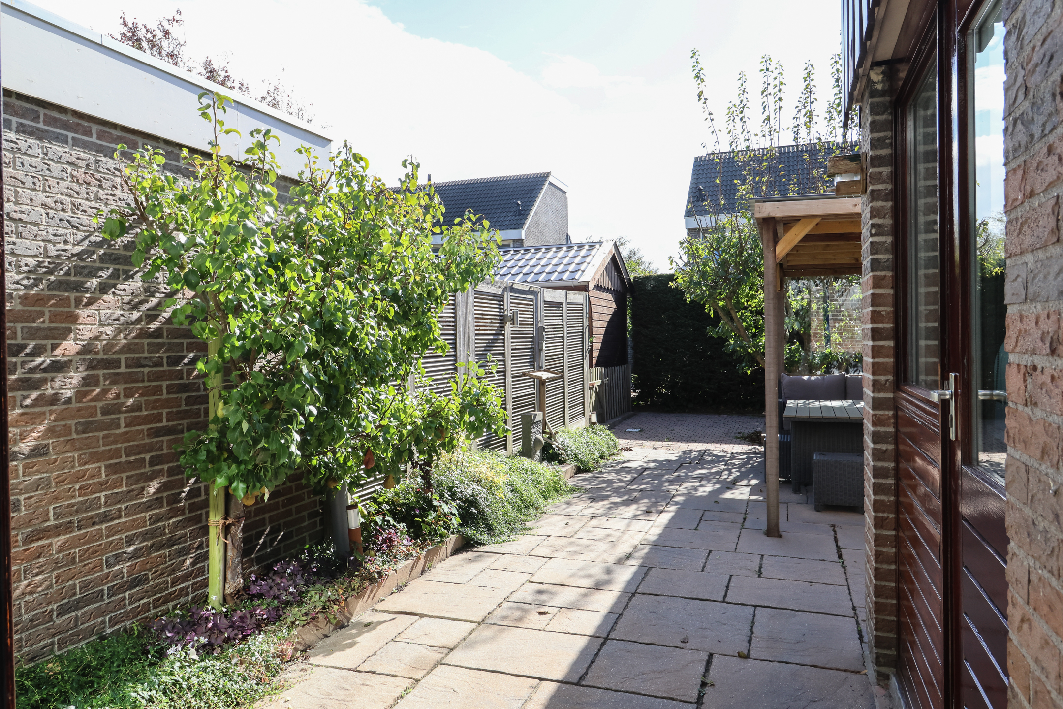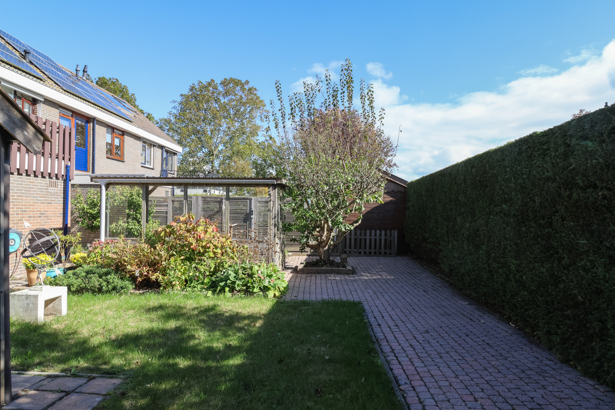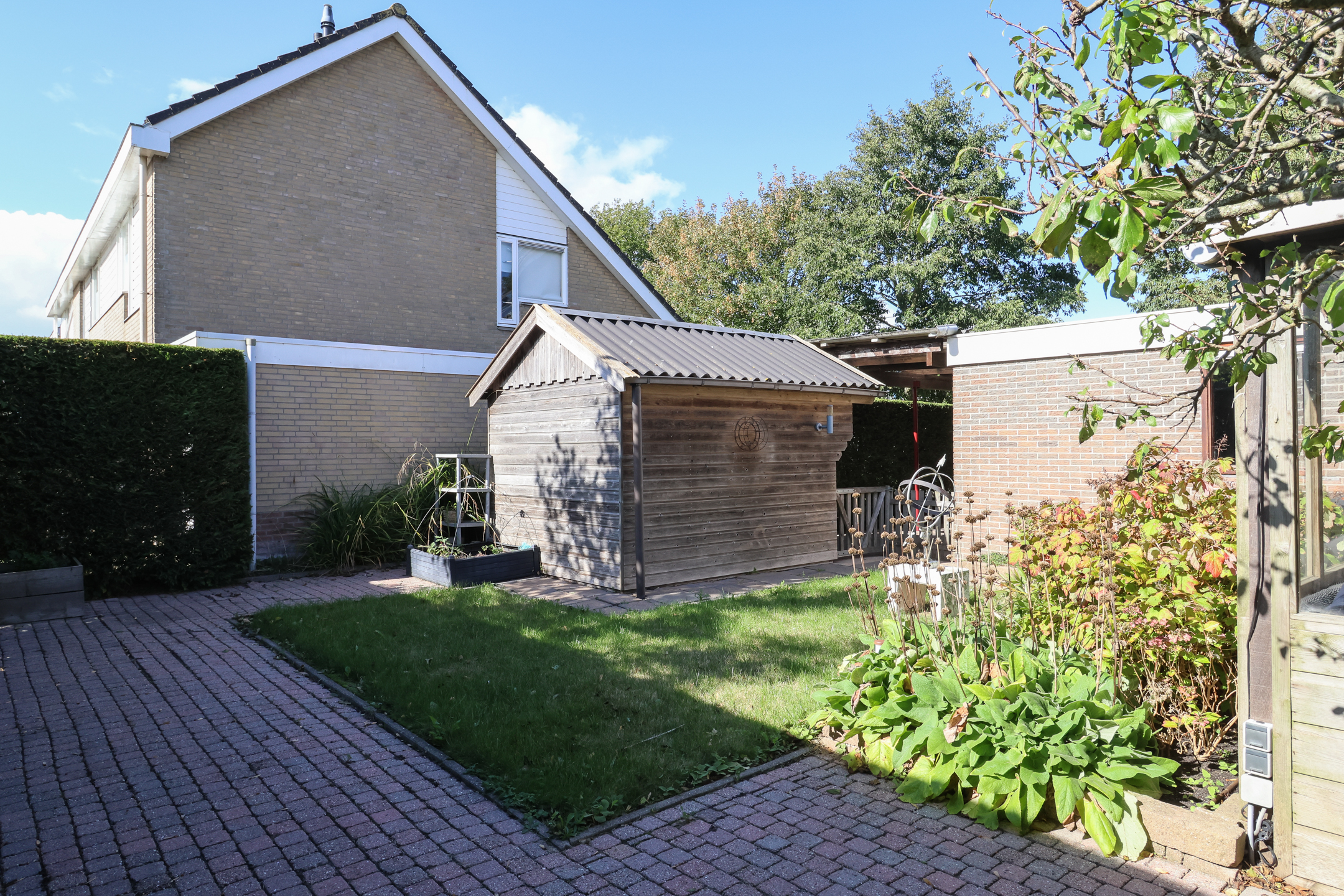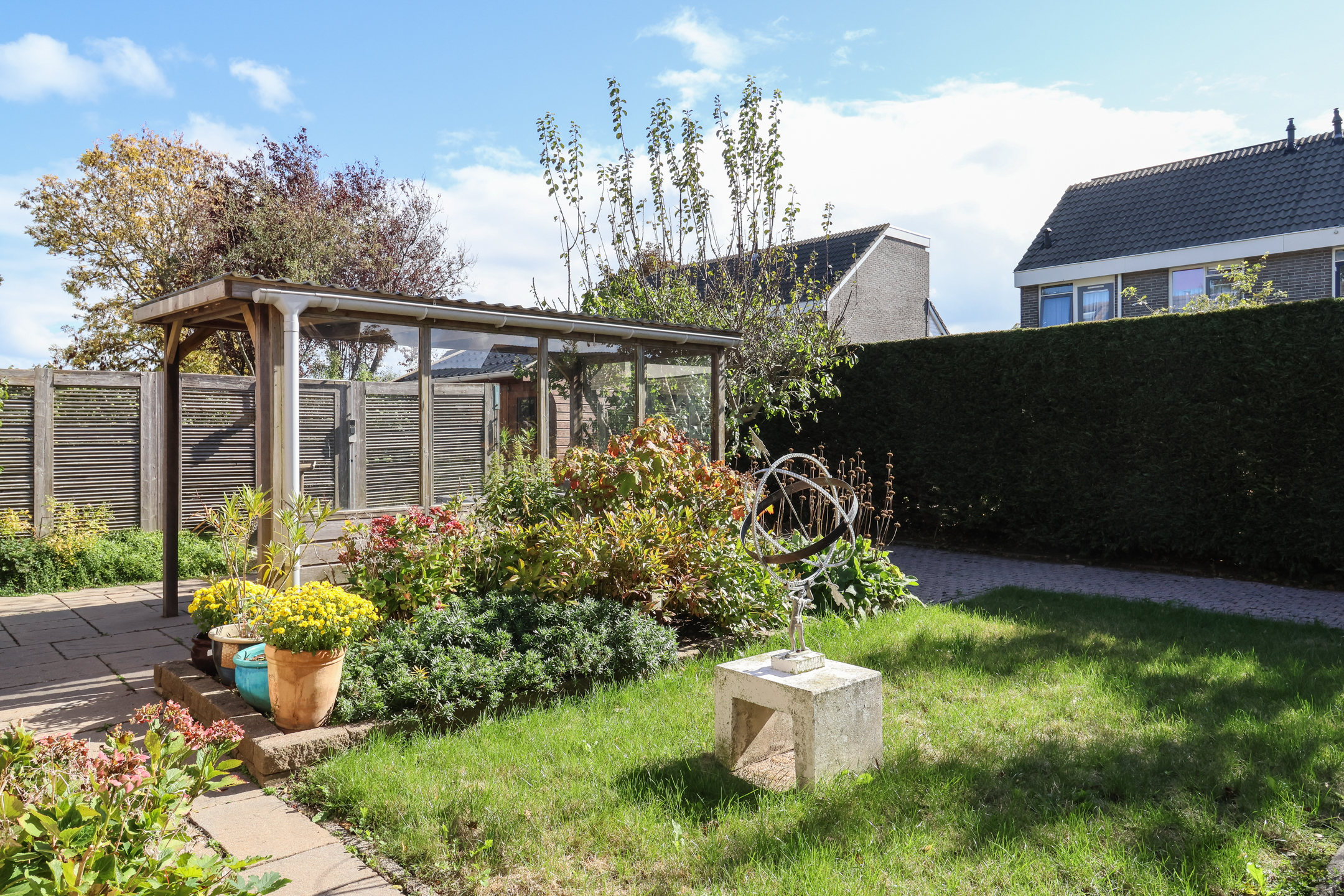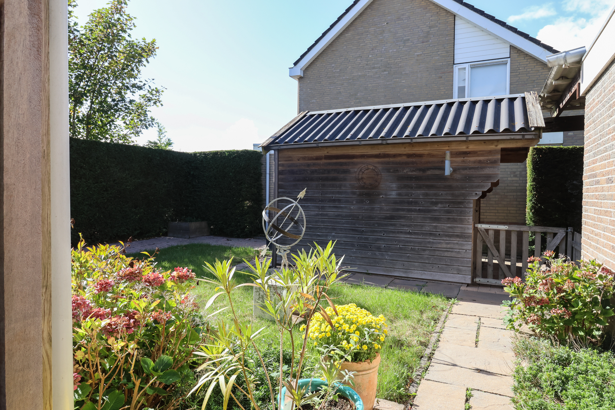 De fraai aangelegde tuin is gelegen op het zonnige zuiden en biedt volop privacy. Dankzij de speelse indeling kunnen er diverse zithoekjes worden gecreëerd om op elk moment van de dag te kunnen genieten van zon of schaduw.