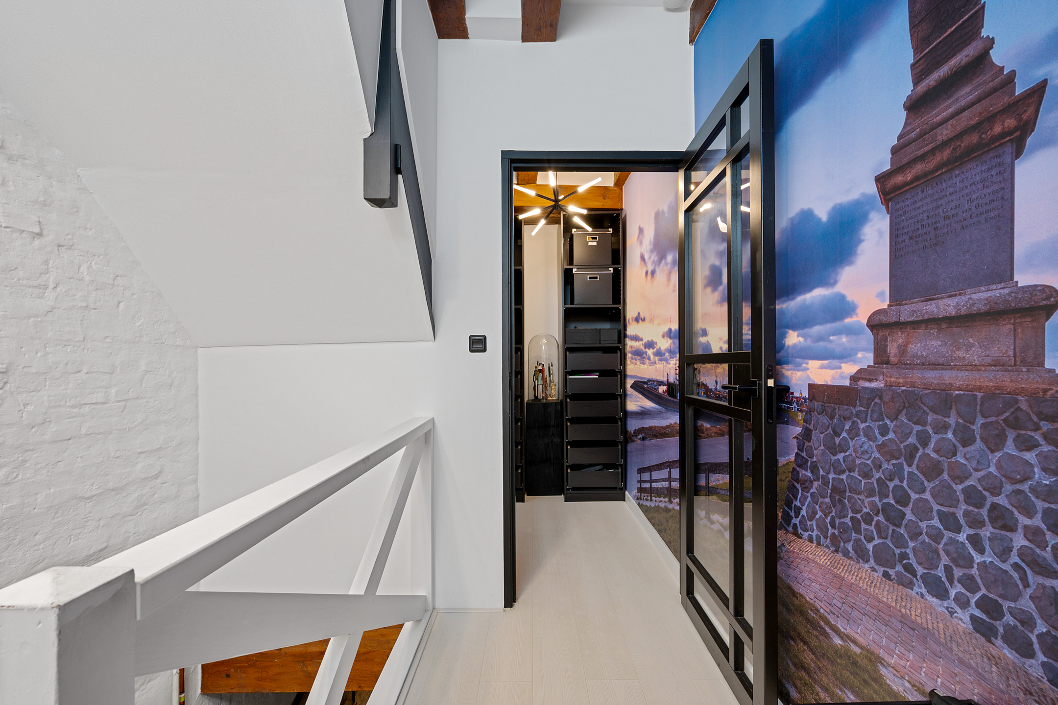 Via de trap bereik je de overloop, waar een nette garderoberuimte is gecreëerd.