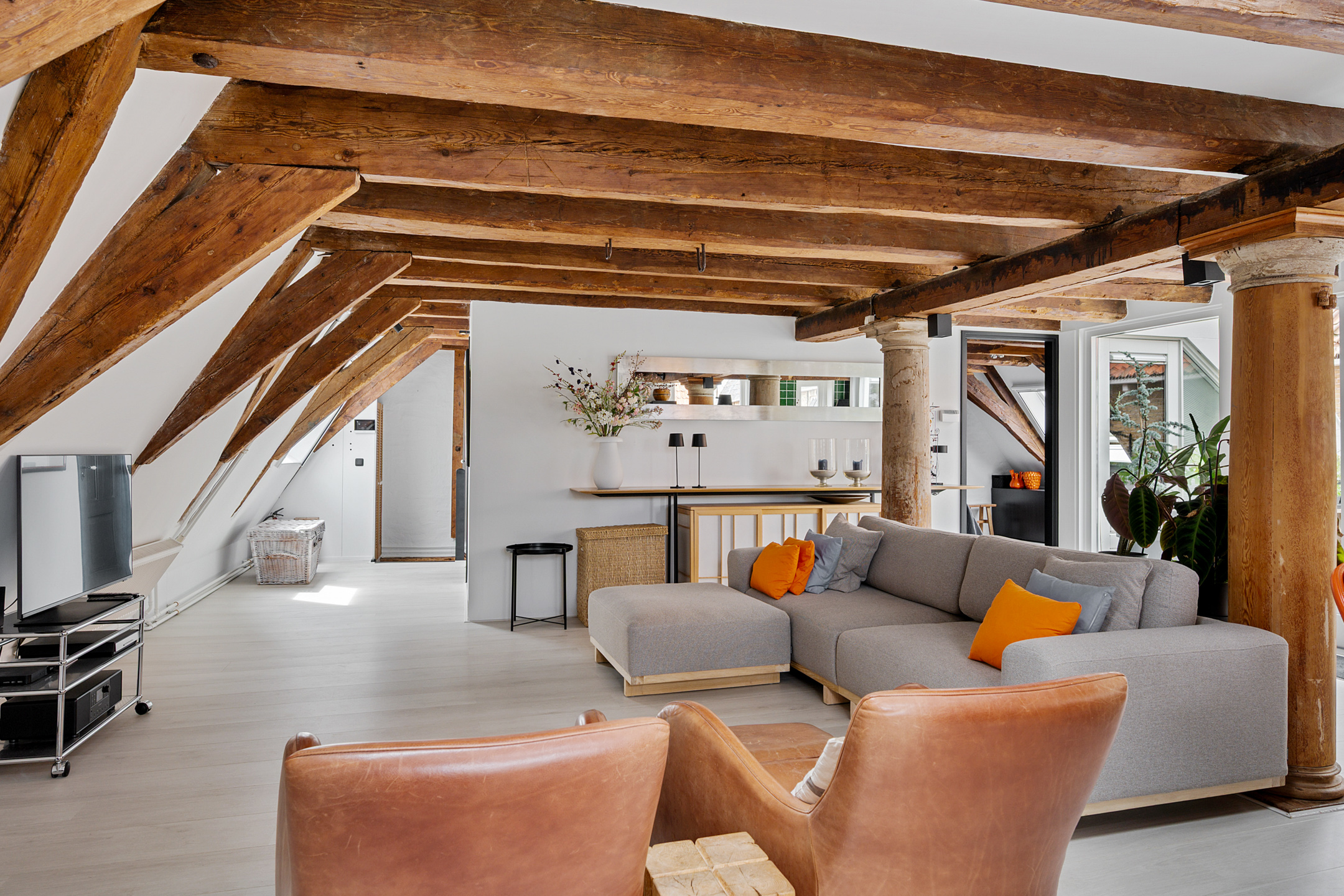 Hier bevindt zich het leefgedeelte: een ruime en lichte woonkamer met grote raampartijen, dakramen en zichtbare balken en pilaren die de ruimte veel sfeer geven. De moderne keuken is van alle gemakken voorzien, waaronder een vaatwasser, gasfornuis met oven, afzuigkap en een Quooker. Ook tref je hier een royale slaapkamer met eigen badkamer, uitgerust met een inloopdouche, toilet en wastafel.