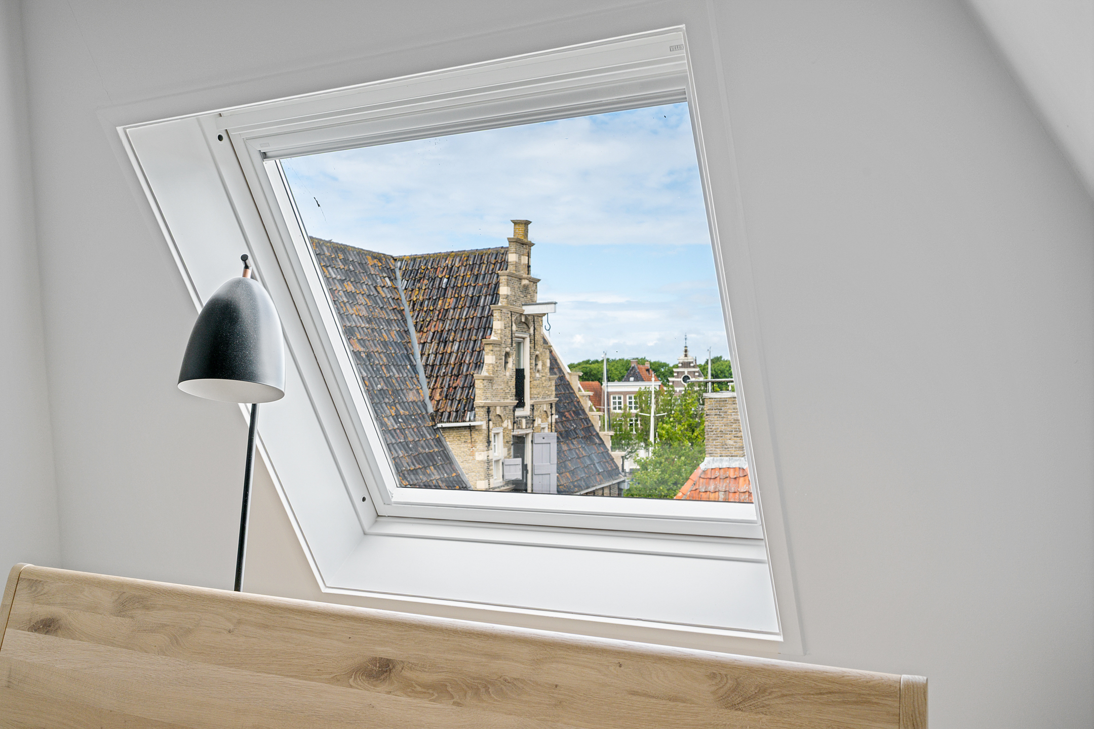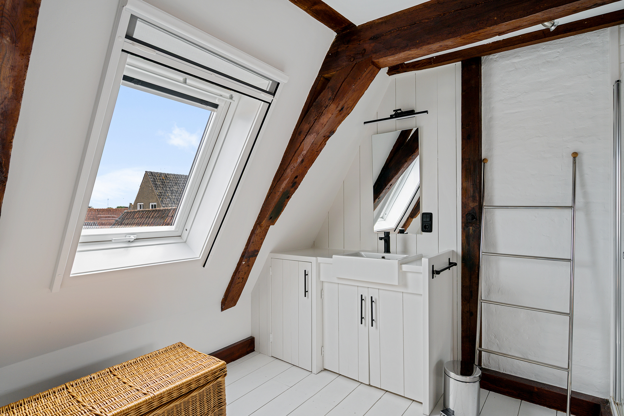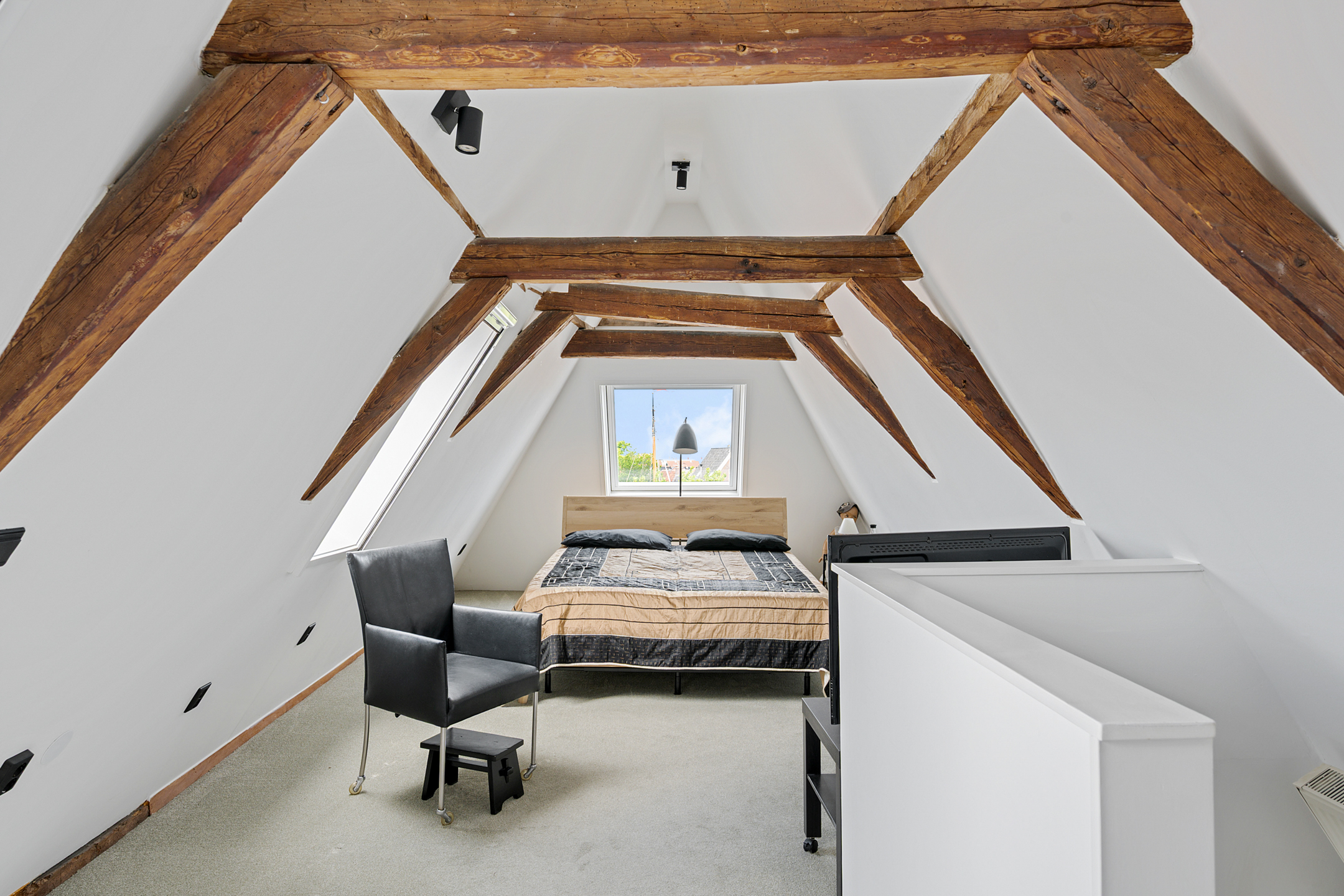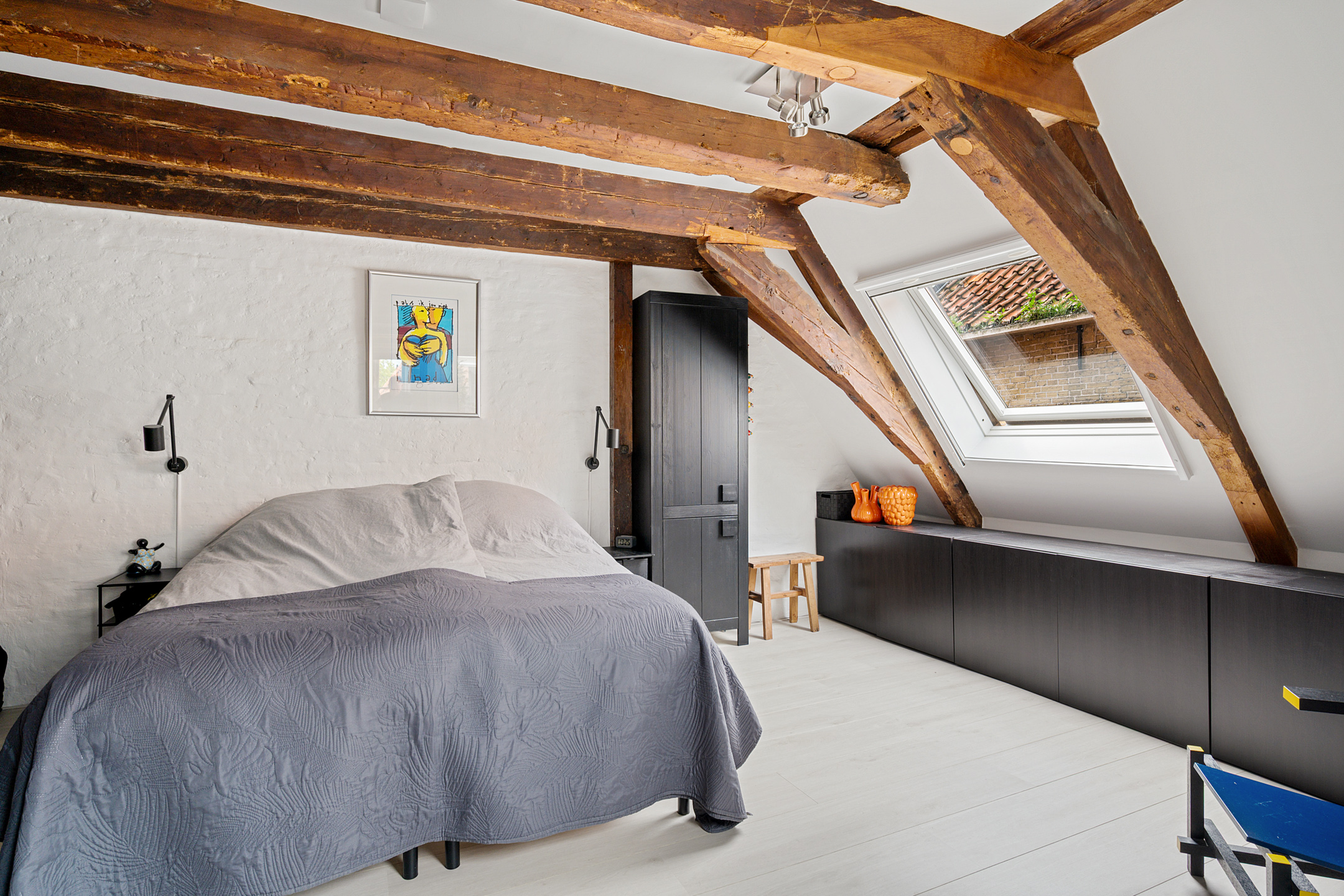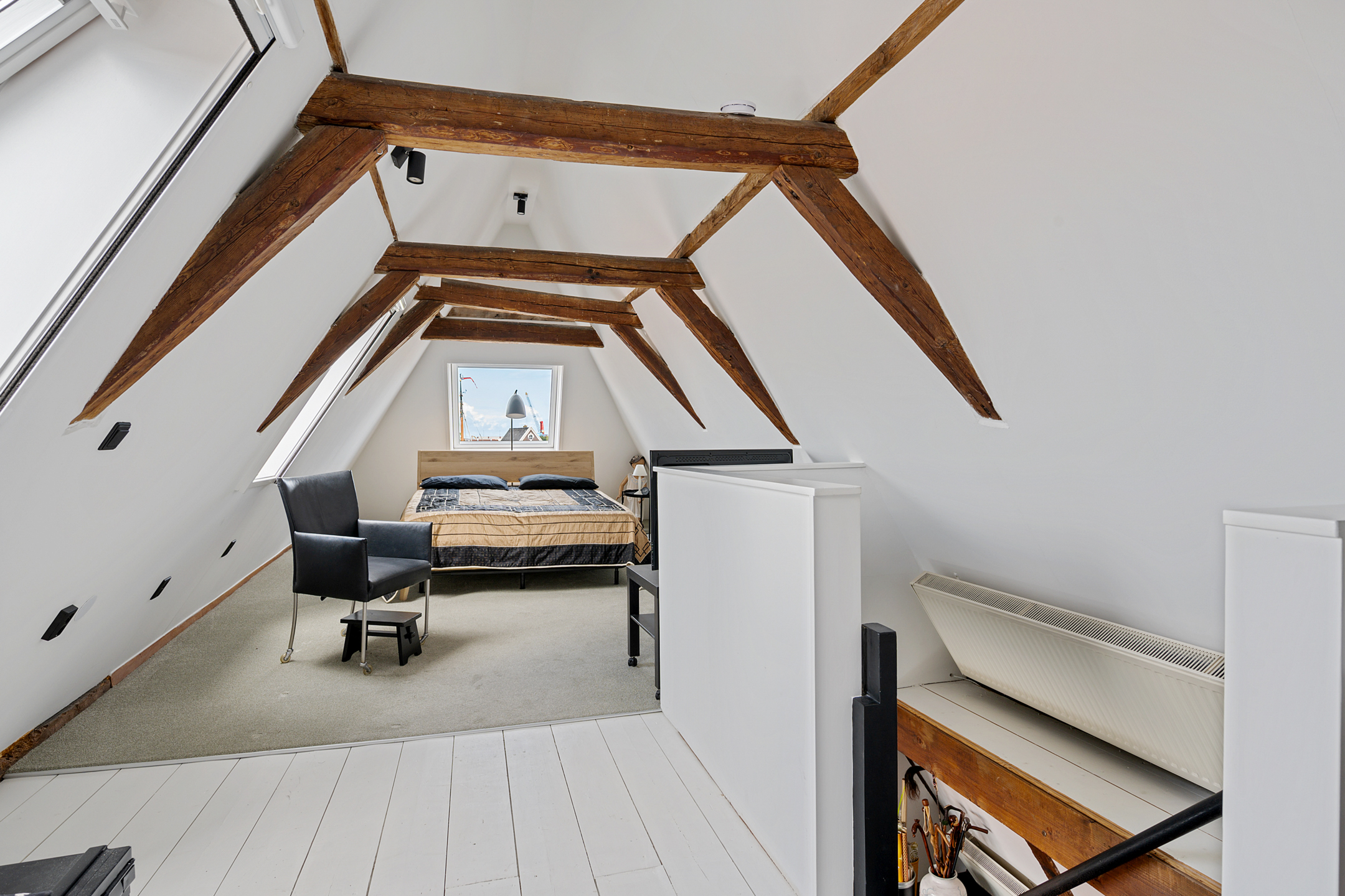 Op de bovenste verdieping is nog een lichte slaapkamer, wederom met veel daglicht dankzij de dakramen.